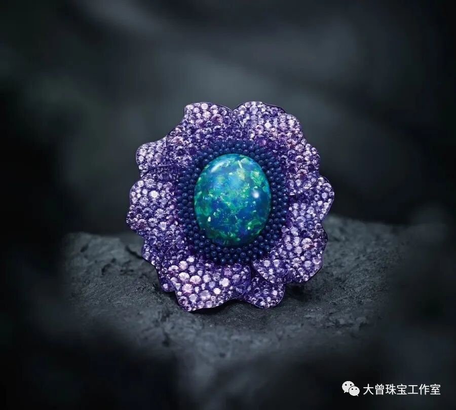 这枚Fleurs D'opales黑欧泊戒指,主石为一颗24.3克拉的黑欧泊,呈蓝、绿色变彩,花瓣部分采用电镀蓝紫色钛金属制作,镶嵌紫色蓝宝石和紫色水晶,戒托则模仿花朵的枝干造型,采用白金材质,镶嵌圆形切割沙弗莱石。