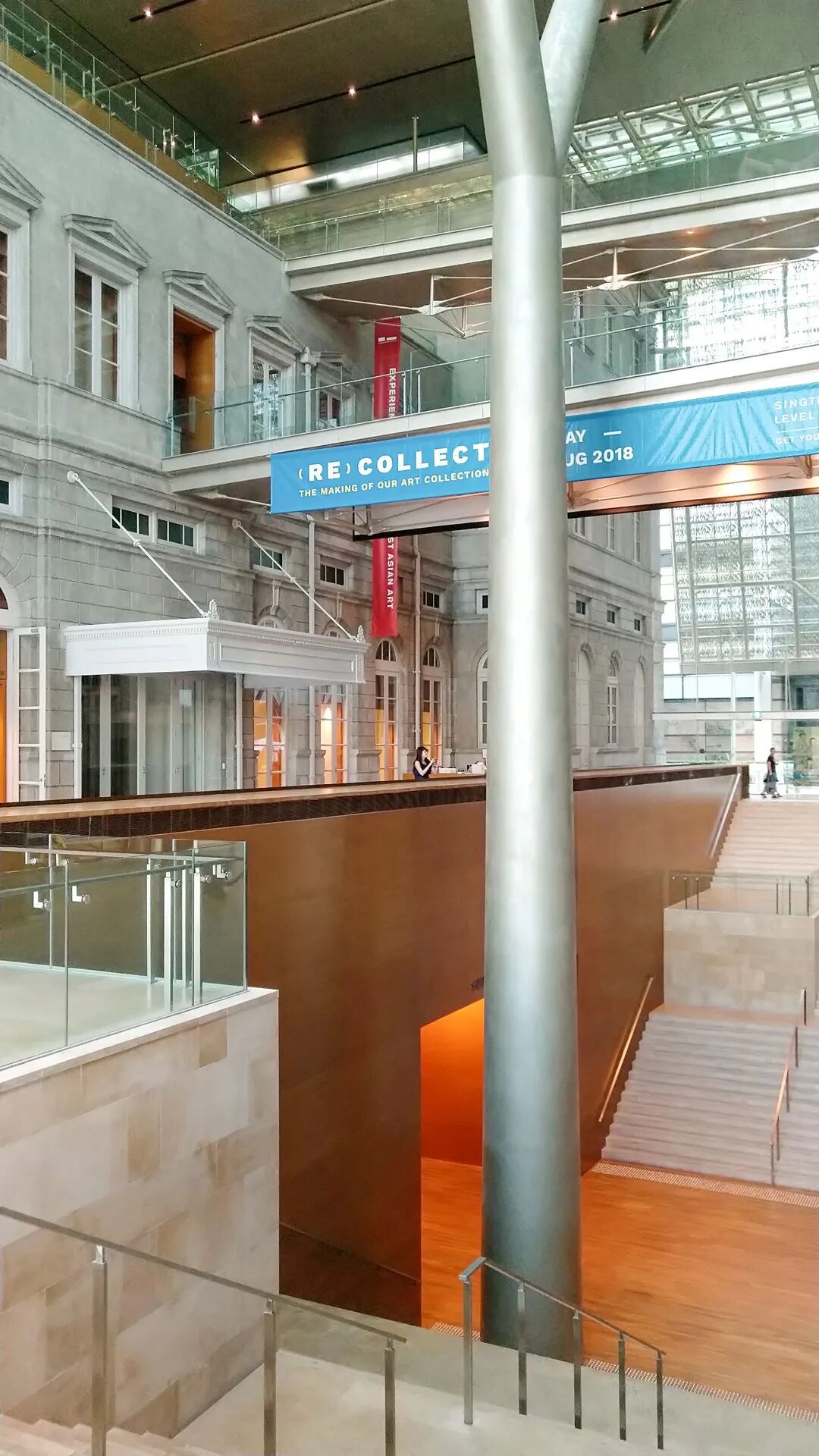 国家美术馆大概是这里面我最喜欢的建筑了。基于原有的新加坡最高法院及市政大楼改造而来,主要的公共空间区域免费开放,参观展厅内需要门票。公共空间的改造可以说是令人惊喜。利用玻璃屋顶的加建将两栋建筑的空间融合为了一体,在两座建筑之间利用独特的穿孔铝板屋顶营造出新的出入口。利用独特的树叉状造型柱支撑起整个屋顶,同时穿孔铝板独特造型的阴影投映在古建筑的墙体上,产生出别样的质感,如同在巨大热带树木的树荫之下。屋顶空间被改造为了水景花园,同时增加了餐厅酒吧的功能。而水景所覆盖着的恰恰是东北侧建筑大厅的玻璃屋顶。水波被投影到建筑的墙面上,为固定的形体带来了运动的效果。西南侧的建筑内部则把树枝状的支撑与原有的穹顶结合,带来别样的建筑视觉感。