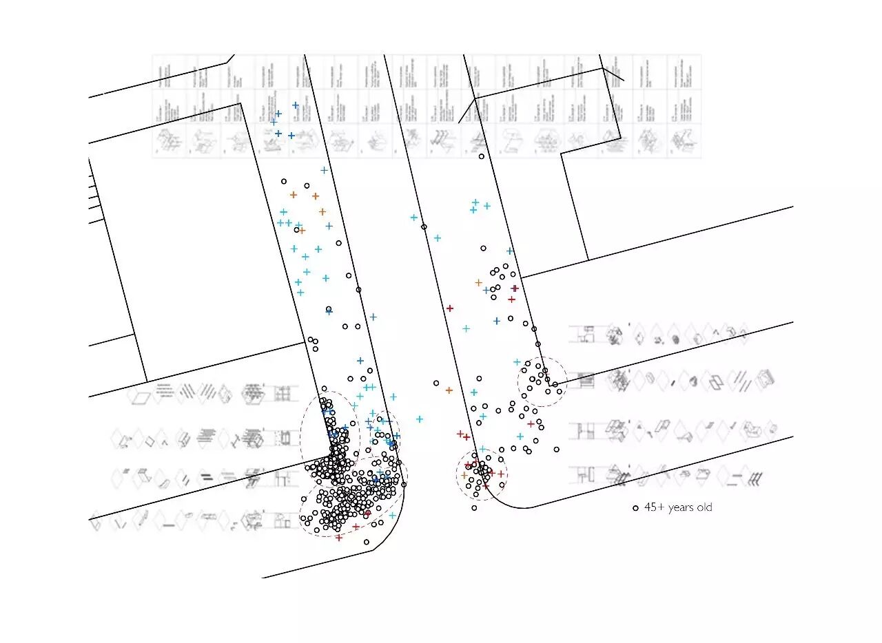 基于4个时间段、工作日/周末、性别、年龄、微气候、无形空间、流动空间、步行类型等分类,图绘共享空间(平面图,轴侧图与图解)