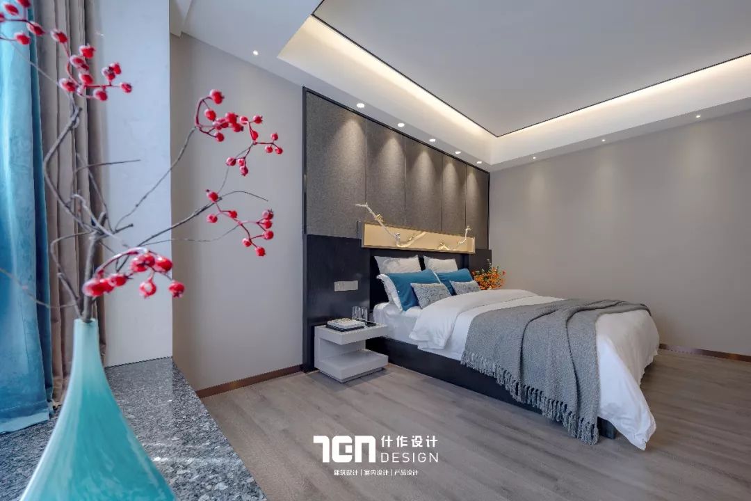 利用颜色打造不同卧室风格,简约酒店式设计,素雅的全屋墙布使空间更柔和雅致,立面顺延到顶部的线条造型使睡眠环境更具舒适的包裹感。