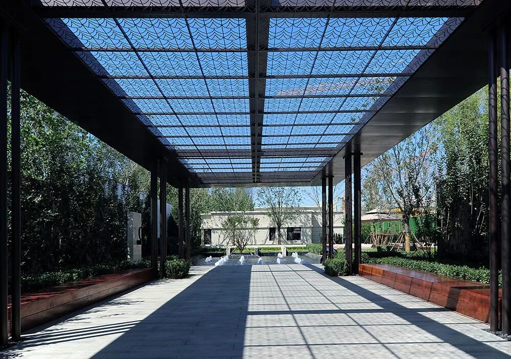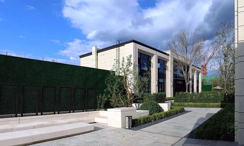 在artdeco经典的古典线性装饰艺术下增加了以植物纹样为肌理的柔和的元素。使得空间在突出仪式感的同时,不失去景观应有的温馨感。入口的廊架给人从停车场进入的第一印象,阳光从高大的金属镂空花纹中投射下来,巨大的空间中充满仪式感和艺术性。而眼前的水面喷涌而出的喷泉给人以静谧的快感。转折延竹林和绿篱组成的小径进入到广场空间对应的背景墙以优雅的法国白木纹搭配杉树形成艺术的对景墙。样板区的院落式的休息区又能为访客提供轻松的休闲氛围。