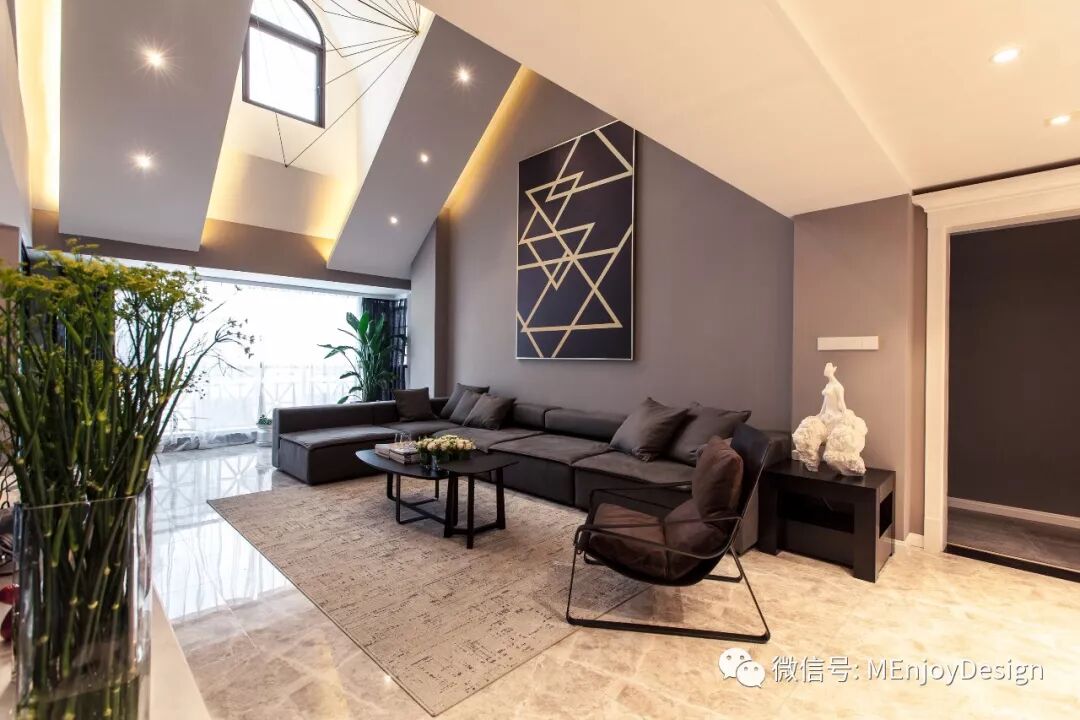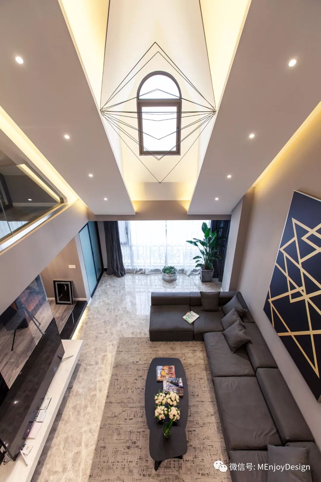 設計說明:本案在原有人字形屋頂建築空間下,引入貝律銘盧浮宮玻璃金字塔的概念,以鉆石(隱喻客戶新婚,對堅貞情感的美好祝願)切割的幾何手法,營造簡約的空間氛圍,註重空間的光影變化,最終將原有建築空間人字形屋頂很好的與光影契合,成就空間獨特的體驗感受。而設計語言的感受是使用者在自己的空間中根據四時和時間的變化更替去發現,使之讓人溫暖動容。