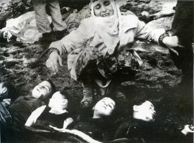 1983年10月30日凌晨5点,土耳其东部发生了里氏7.1级的强烈地震,147个村庄毁于一旦,1336人丧失生命。地震发生时,37岁的厄泽尔太太像往常一样,正在和她的丈夫一起挤牛奶,因而幸免于难。可他们的五个熟睡的孩子却全部被活活埋在瓦砾堆中。记者捕捉的是5个同时丧生的孩子从瓦砾堆中被挖出后陈放在父母面前,正要全部被埋进墓穴的那永别的瞬间。中年丧子是人生的最大悲痛之一,而这位37岁的妇女一次丧尽全部子女的痛更是痛不欲生。她左手抓住丈夫的腿,那是她唯一的精神支柱了。身后的背景告诉读者,这里承受同样灾难的不止他们一家。