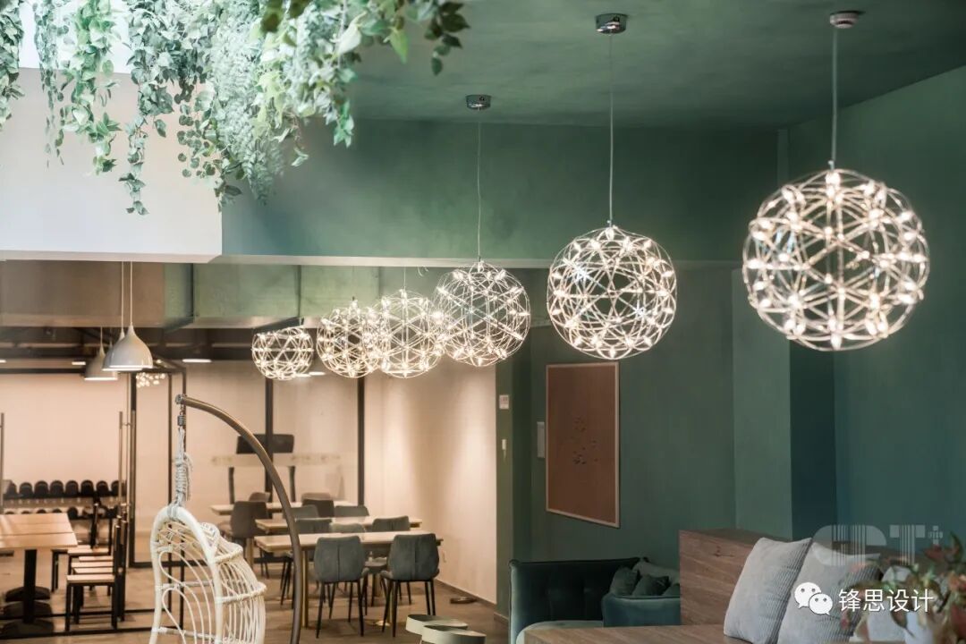 进入地下公区,也即是来到了“绿光森林”。这里模拟室外天光加上绿植的点缀,营造出世外桃源般的静谧感受。绿色且柔软舒适的家居,消除了地下阴暗的压抑感,坐在摇椅上可以悠闲地享受下午茶时光。