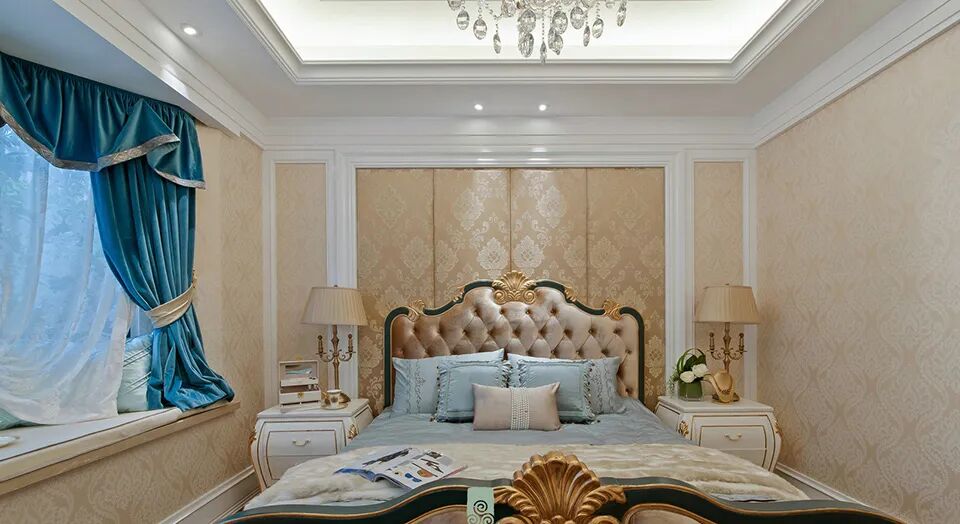 ▼ 主卧混合了粉色系和深色质感的家具,简约而独特的吊灯,吊顶的凹凸叠级,则是融入了法式宫殿情怀
