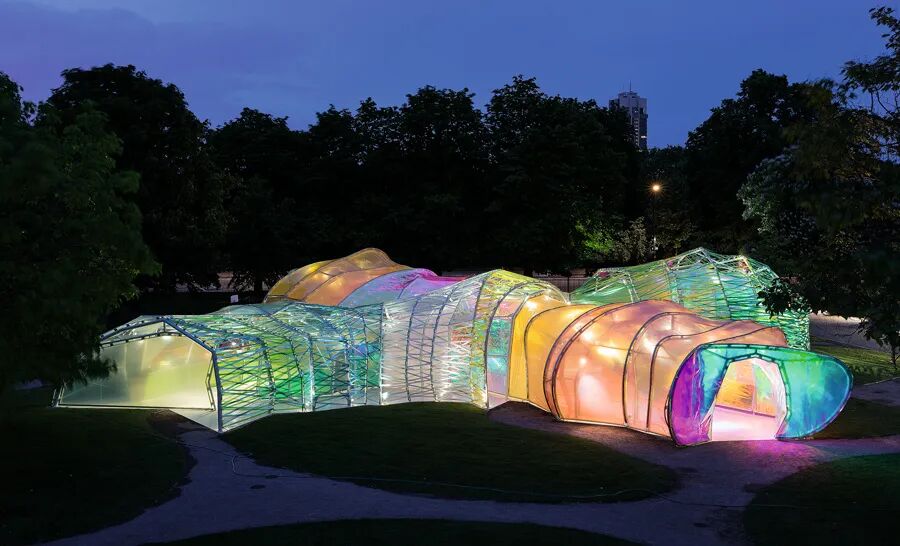 该馆是由SelgasCano在2015年设计的,这个蛇形画廊馆由最小的钢结构框架外面包裹着五彩缤纷的氟塑膜——用聚氟乙烯制成的塑料片和塑料带。设计的灵感来自伦敦地铁,那些将塑料板结合在一起形成的一系列动态隧道,这些塑料板在框架之间有着良好的可塑性。