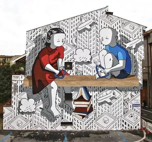 在意大利北部的一下小城市里,艺术家Millo的创意涂鸦随处可见,他喜欢运用卡通的绘制出小孩子喜欢的游戏与各种幻想,勾勒出孩子们天真无邪的性格,整个城市都是他们的游乐场,他们可以“生活”在自己幻想的世界中,Millo的作品仿佛有一种魔力,可以在表达自己的同时,也会让观者感到轻松与自由。