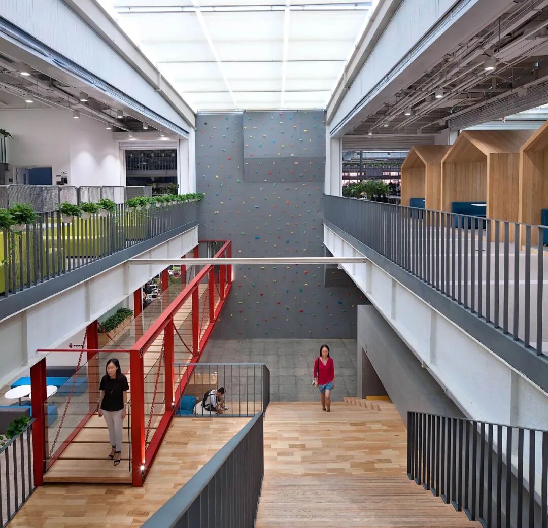 在互联网公司中,由于年轻人的思维非常活跃,且充满热情,我们会在空间中融入咖啡、健身等元素以及各种娱乐空间,一些大型互联网公司甚至会专门设置游戏设施,同时我们也会将团建、学习培训等区域,融合在开放办公区间内,除此之外,萌宠乐园,胶囊公寓等临时客栈性质的空间也常见。我认为互联网公司总体达到一定规模,会成为城市商务综合体。