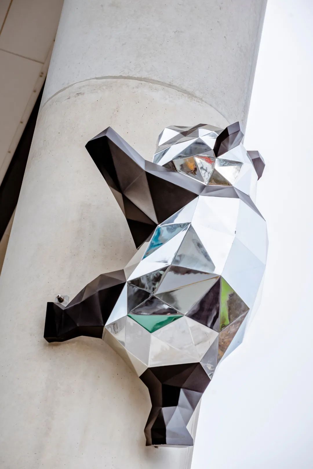 熊猫象征中国,作为外交“使者”,向世界传递着热爱和平与友谊的国际形象。材质上以镜面不锈钢为主,传承了“钢铁之城”的在地文脉,反射出色彩斑斓的光的同时也增强了空间里人、艺术品与环境的互动性。