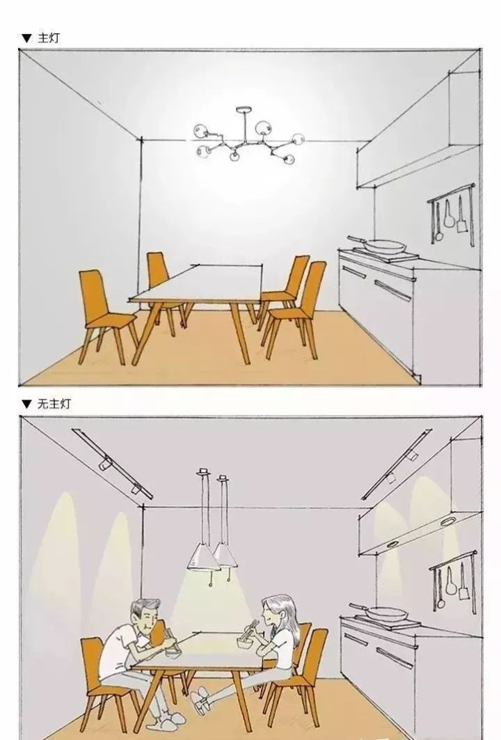 ▲有主灯餐厅几乎可以做到无死角照明,但无法对局部进行强调,无主灯餐厅,每个部位可根据需要进行灯光设计,实现多种生活场景融合,餐桌吊灯能突出用餐区,促进食欲,橱柜射灯突出照亮操作区,避免人挡住顶灯照明带来的死角。图片来源@草三冉
