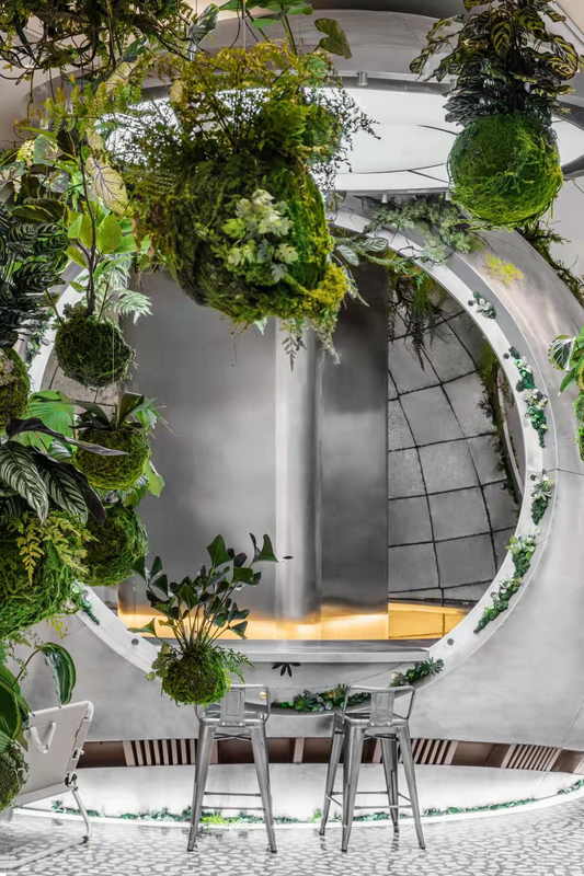 头顶上的浩瀚星空,无疑能引起我们无限的遐想。申江海在这个新店的设计中,依旧采取了简介而又独具吸引力的设计手法,极具未来与科幻感的太空舱置入到闹市的小店里,材质对比的冲击效果被充分发挥,冰冷的金属、暖色的木头、橘黄色的灯光、桌台上的镜面等在这里碰撞交织,再加上几笔几点的绿色生机,俨然创造了一个专属这里又独具特色的时空,让这个时空中的人与空间进行对话,与自己进行对话,产生无限的思想与共鸣。