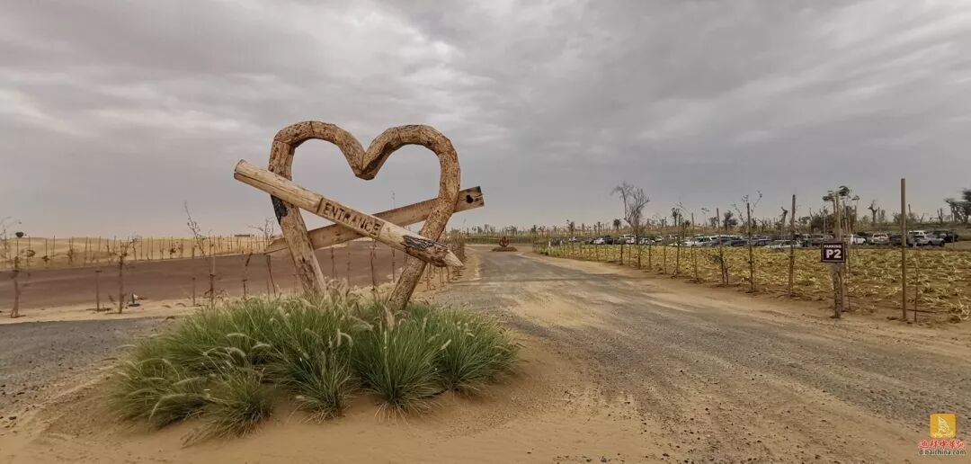在滚滚沙漠中两个心型人工湖相迭,犹如两颗互相依偎的心脏。象征不管往后的路途多艰辛,相爱的两人也会彼此扶持。