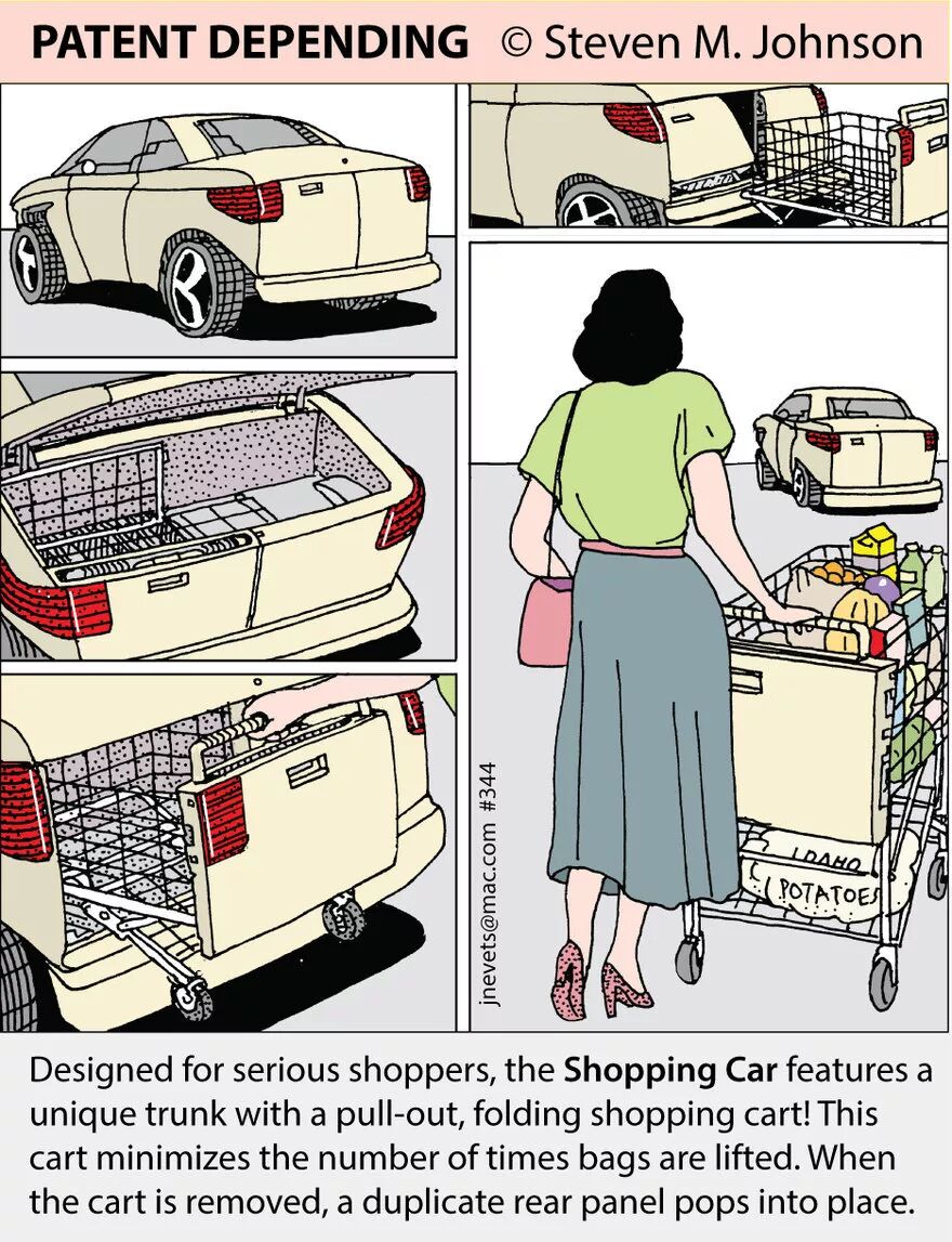 几年前荷兰设计师 Bruin Bergmeester 设计出了走路自行车。而 Steven 早就画出了可以坐着开、站着开和边跑边开的摩托车与汽车。日本设计师创作过的将领带与雨伞遮布融为一体的领带伞,Steven 也在多年前就设计出来了~另外,我们都知道在很多国外大型超市的代步车是一个很方便的购物神器。