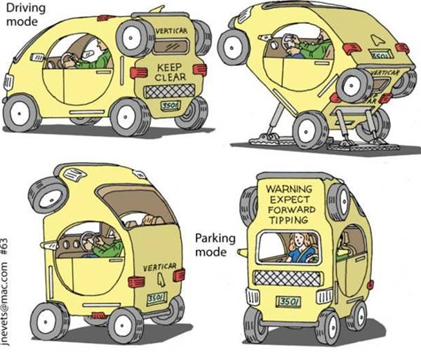 不过在 Steven 看来,他并非什么预言家,只是将自己的一些想法画出来而已。从他的插画作品里,我们能看见他对于未来的想象,还有那些从日常生活需求里延伸而出令人忍俊不禁的设计灵感。当然除了上述这些外,他还有很多脑洞大开的漫画还未被实现,我们一起来瞅瞅吧~他很多精彩的设计都跟汽车有关,这个是直立停车系统。如何在停车位日益紧张的城市中停车?Steven 帮你想出了这招~