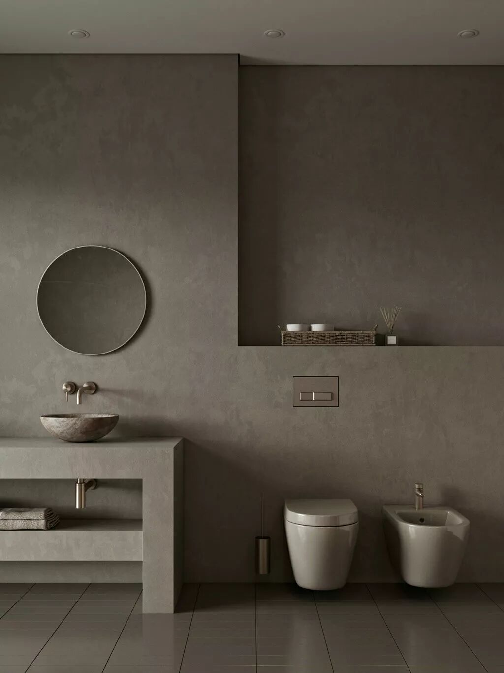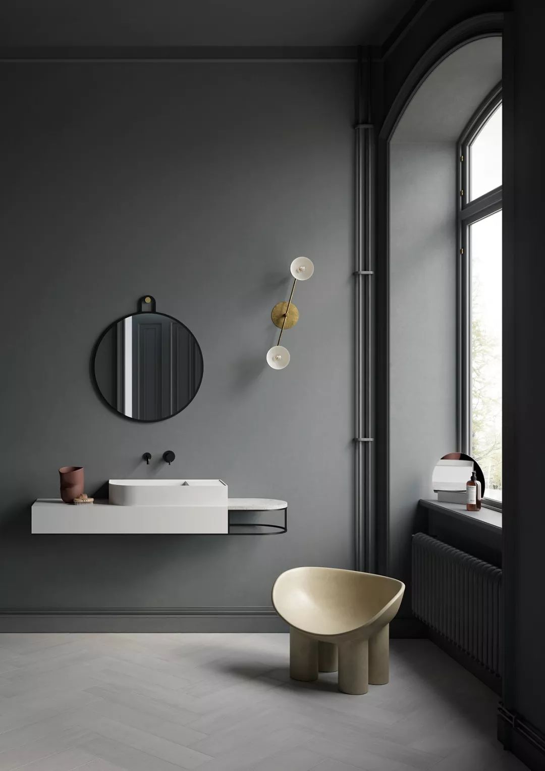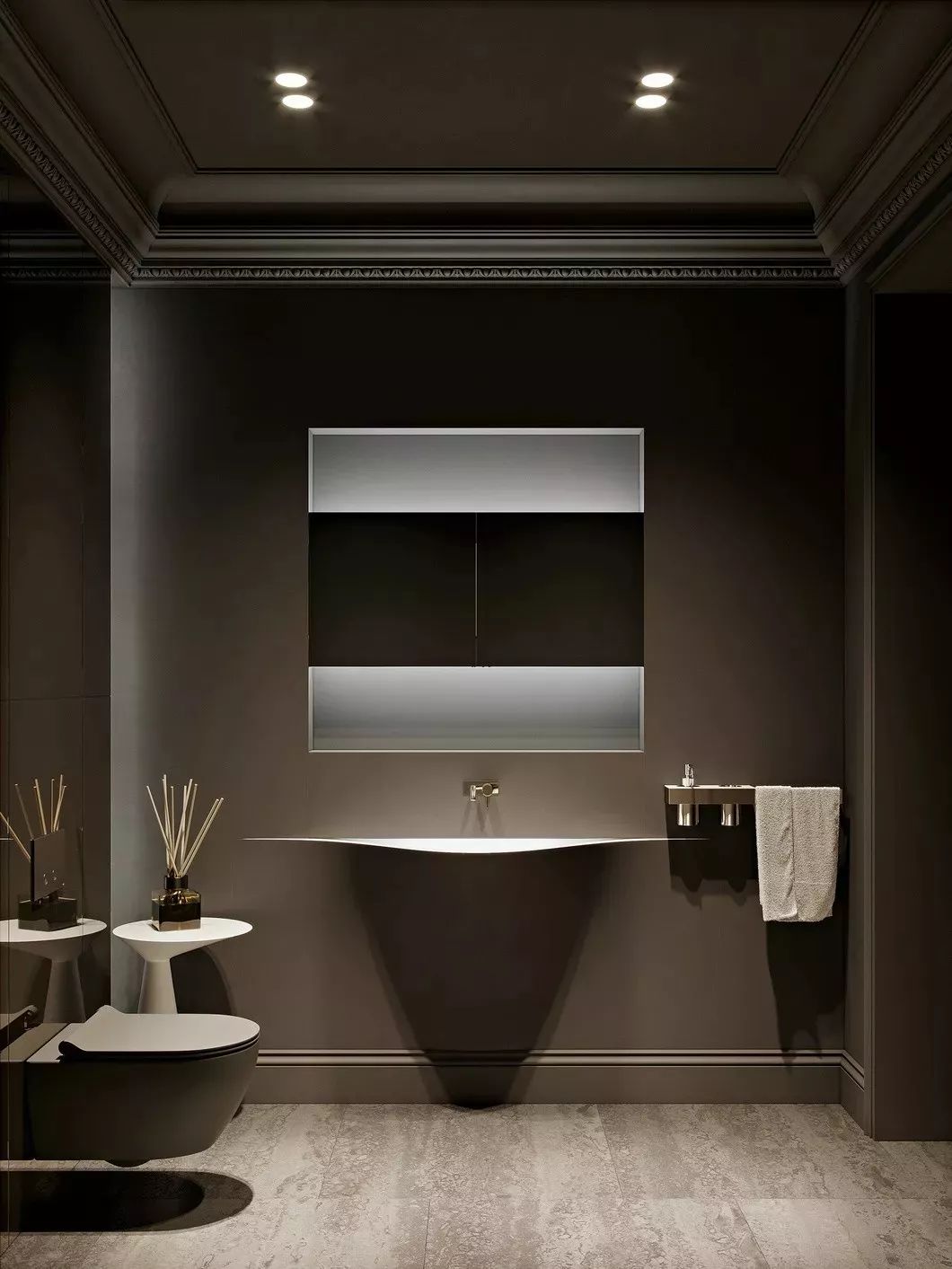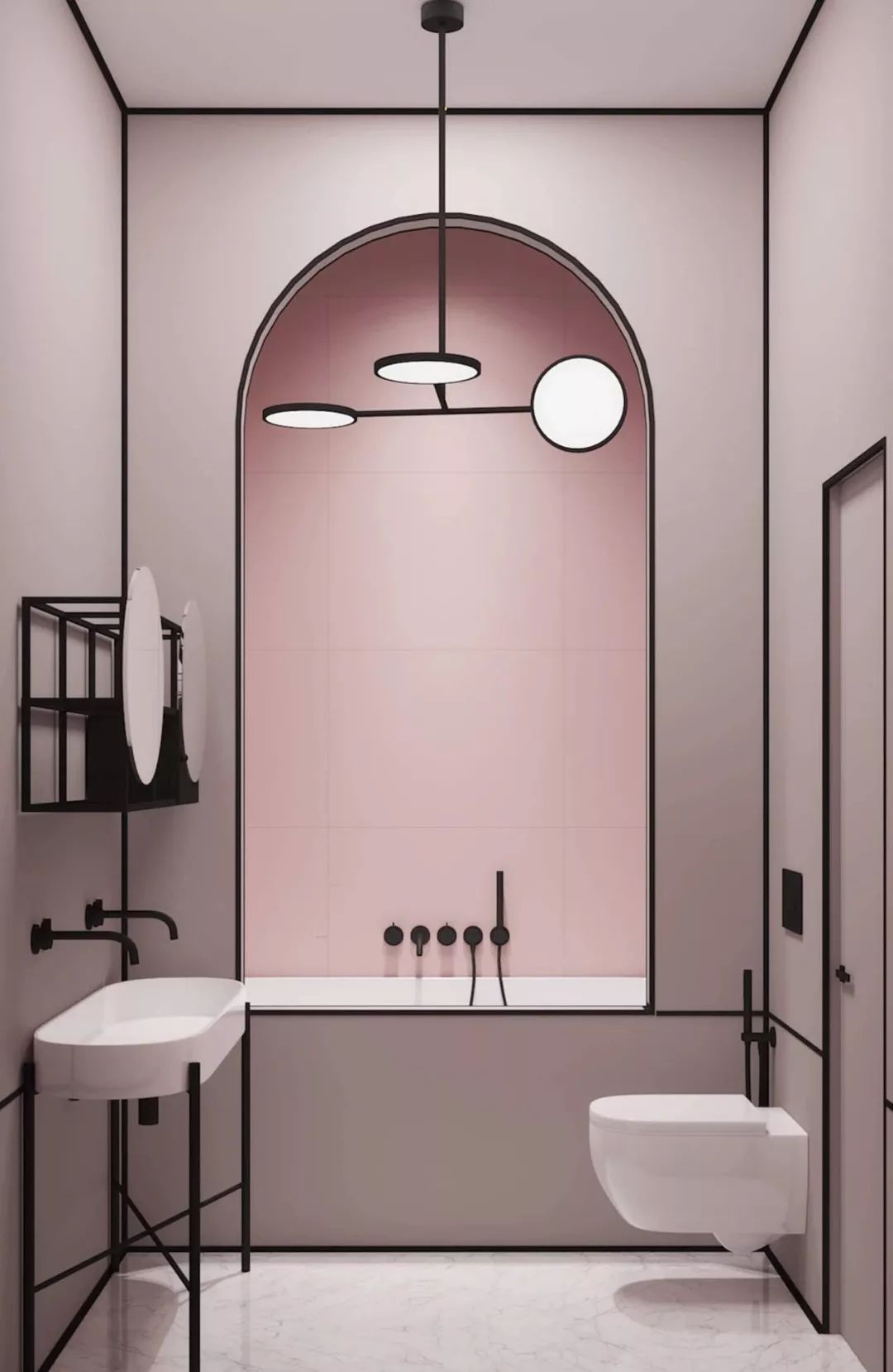 悬挂式洁具给空间增色不少,设计感十足。挂在墙上的洗手池犹如一个装置,一个端景,带来美好的视觉享受。