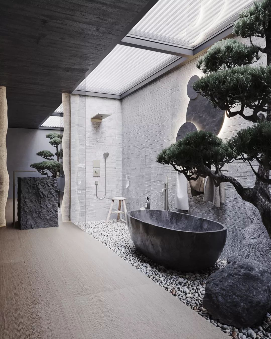 在一些空间较大的卫生间,我们开始将园林景观元素融入进来,使得卫生间有了更多可能,包容天地,吸入景色。