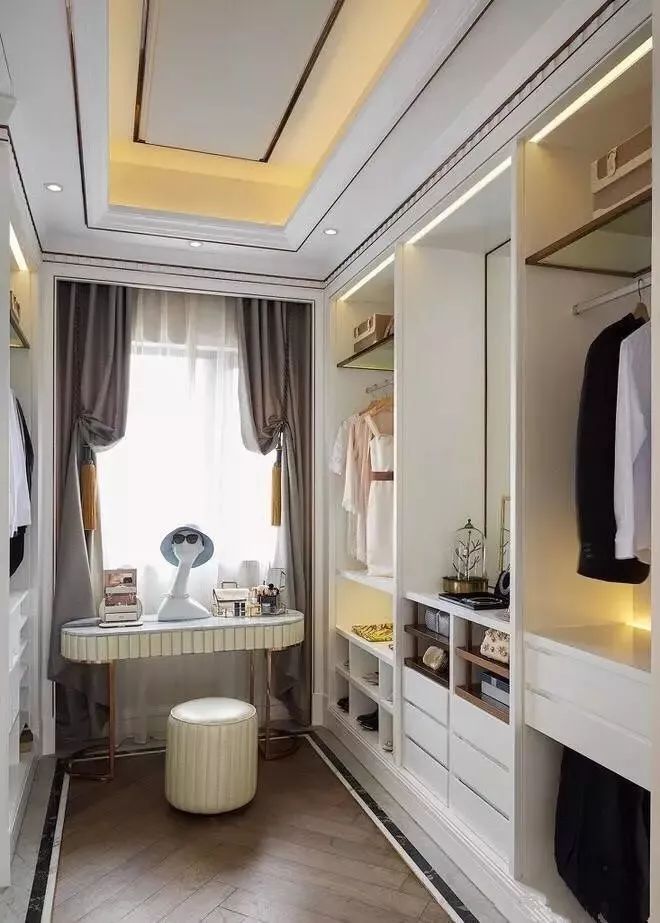 在衣帽间里架设一个梳妆台,能为女主人提供一个更加贴心的梳妆空间,平时穿衣打扮都更加温馨轻松。