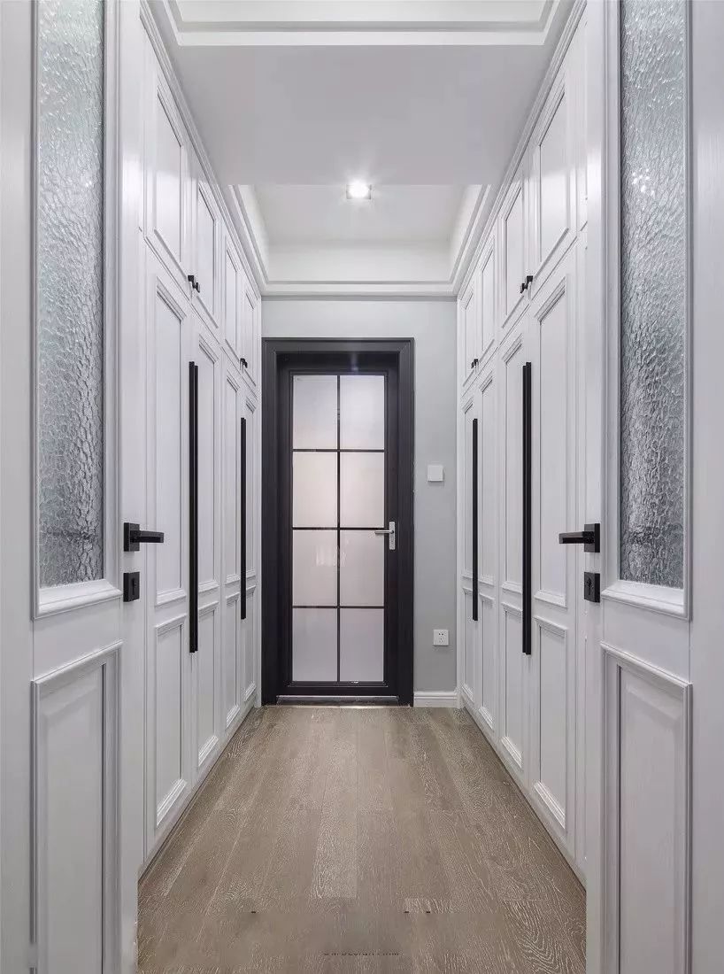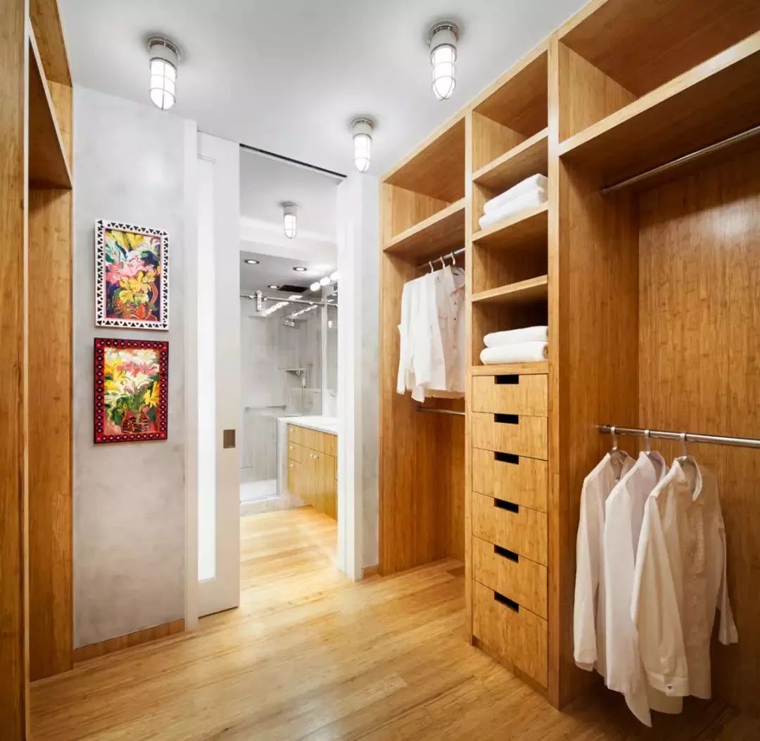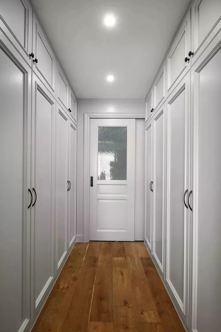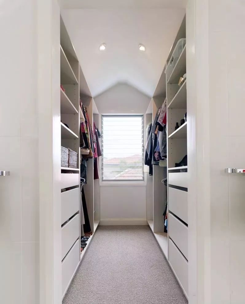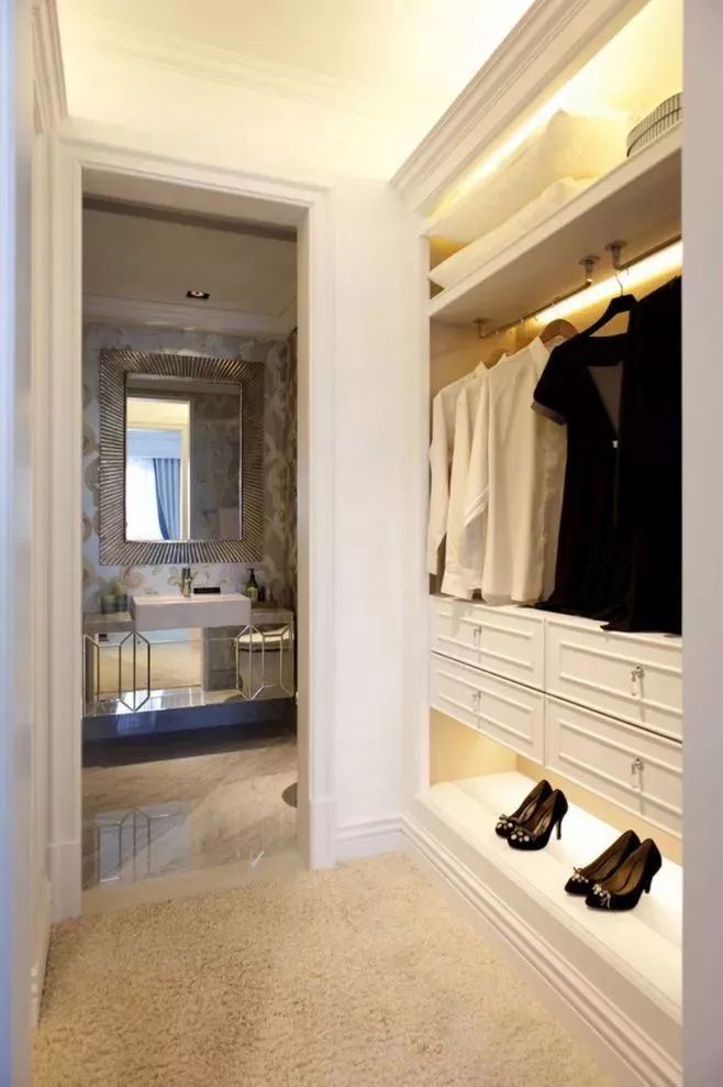 卧室进门位置,或则卧室与主卫之间的通道,就可以利用一下,设计成通道式的衣帽间,虽然紧凑,但也要实用不少。