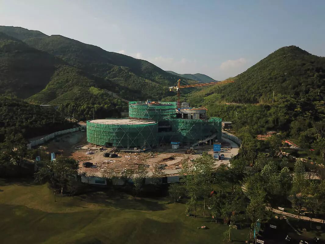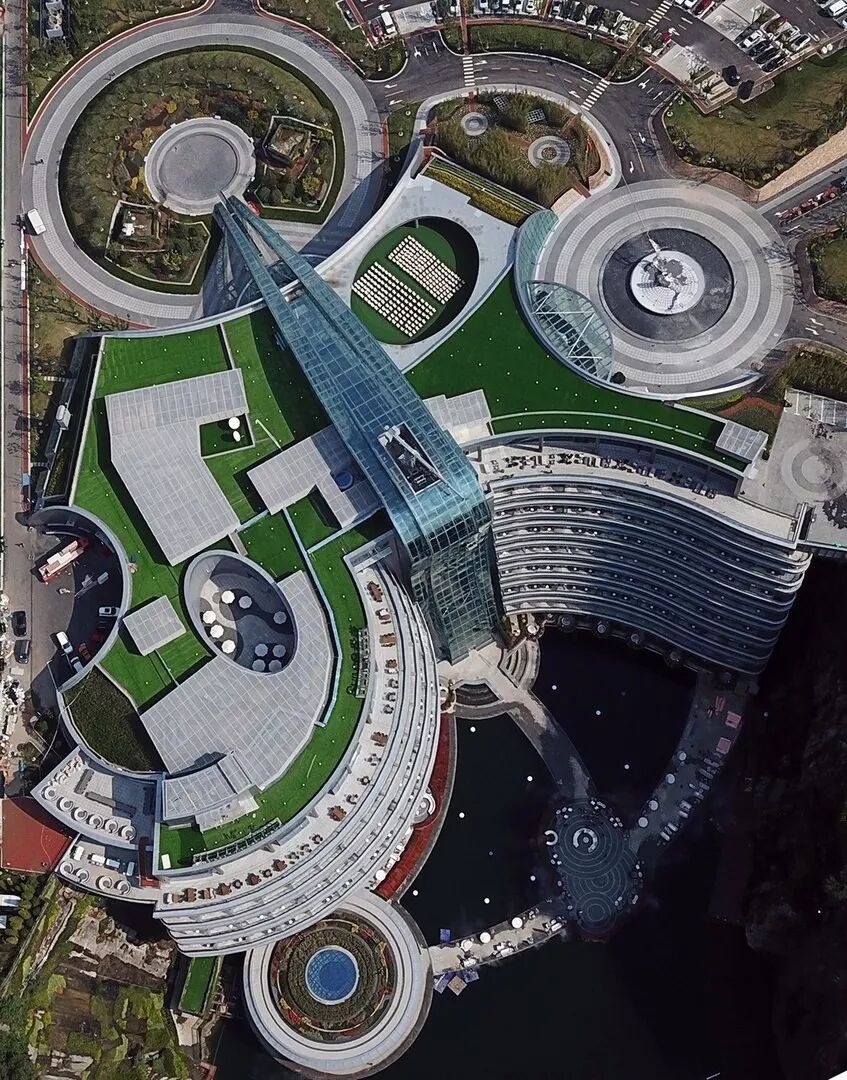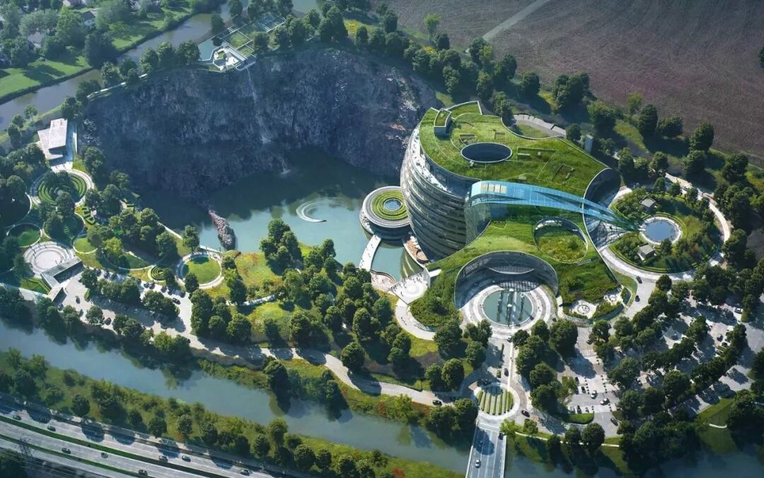 在整体建筑形态上,有三个非常主要的元素。第一是 Green Hill (绿色山丘),为什么“深坑酒店”后来被誉为“世界上海拔最低的高层”,也是和这个绿色山丘有关联的。世茂集团拿下的这个废坑,承载这许多的历史意义,加上佘山的地形地貌特征, 这里的建筑限高仅为20米。所有的主要客房放在坑内,坑上主要为公共区域,即是绿色山丘下覆盖的部分,这也是这个建筑算入建筑高度的部分。这个绿色山丘在形态上呼应了周边的佘山自然风貌和英格兰山丘,同时也是建筑设计手法中的“绿色屋面”,正是节能环保的重要举措之一。