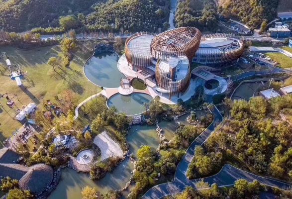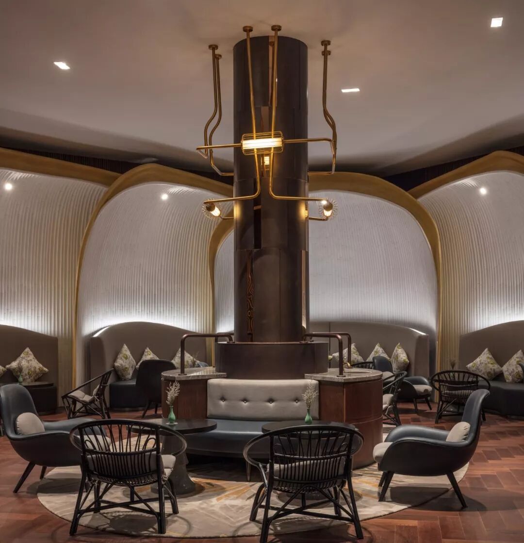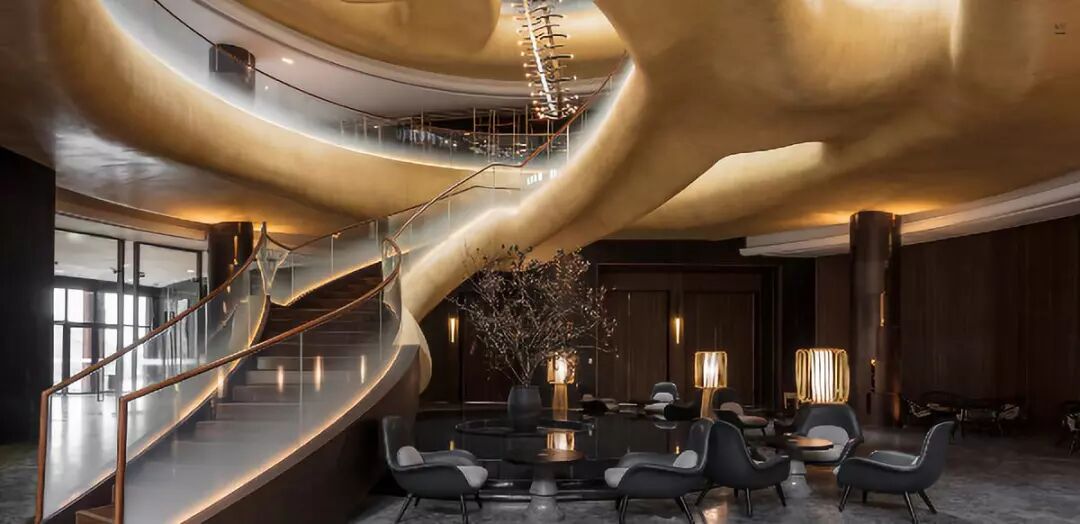 修竹满山、绿荫环径,风吹影舞、芳馨清逸。竹兼具自然人文的淳朴之美,飞云流泉则富含绰约灵动之韵,通过运用动静合一的设计语言和自然流畅的表达方式,令酒店建筑室内外浑然一体,梦幻般吸引着人们前往探秘。不同建筑体块如飞腾的云雾定格,自由疏放,又与大堂中心互相连结,错落有致。