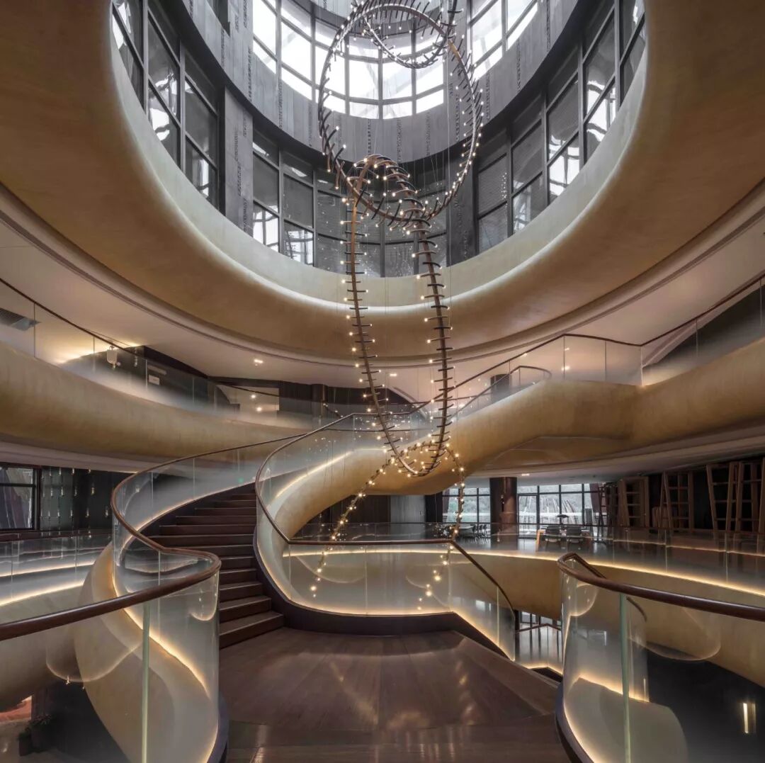 无立柱支撑的旋转楼梯延续了轻盈的建筑外观,完美演绎了茶田的层次和美感,在仅靠侧面拉力的情况下层层递进,将视线引向玻璃屋顶,无论日夜,室内室外,人们皆可随时观望天上云卷云舒。