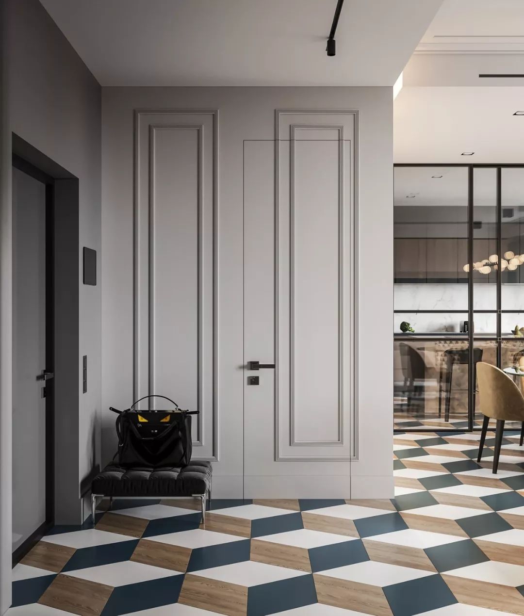 时下流行的护墙板、木饰板以及黑框玻璃隐形门,都有着简洁的线条和独特的质感,可以让门隐藏于无形之中,使之足够成为家居的亮点。