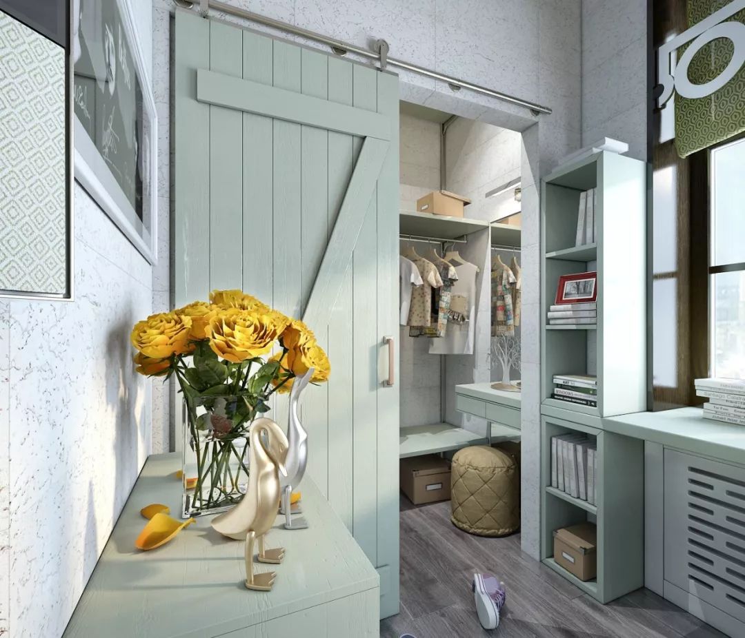 另外,在网红家居中颇受宠爱的“谷仓门”,其实也是值得借鉴的设计方式。它虽然做不到百分之百的隐形,但有利于强化视觉上的统一感,而且不占地方,颜值又高,非常适合在文艺范儿的家庭中安装。