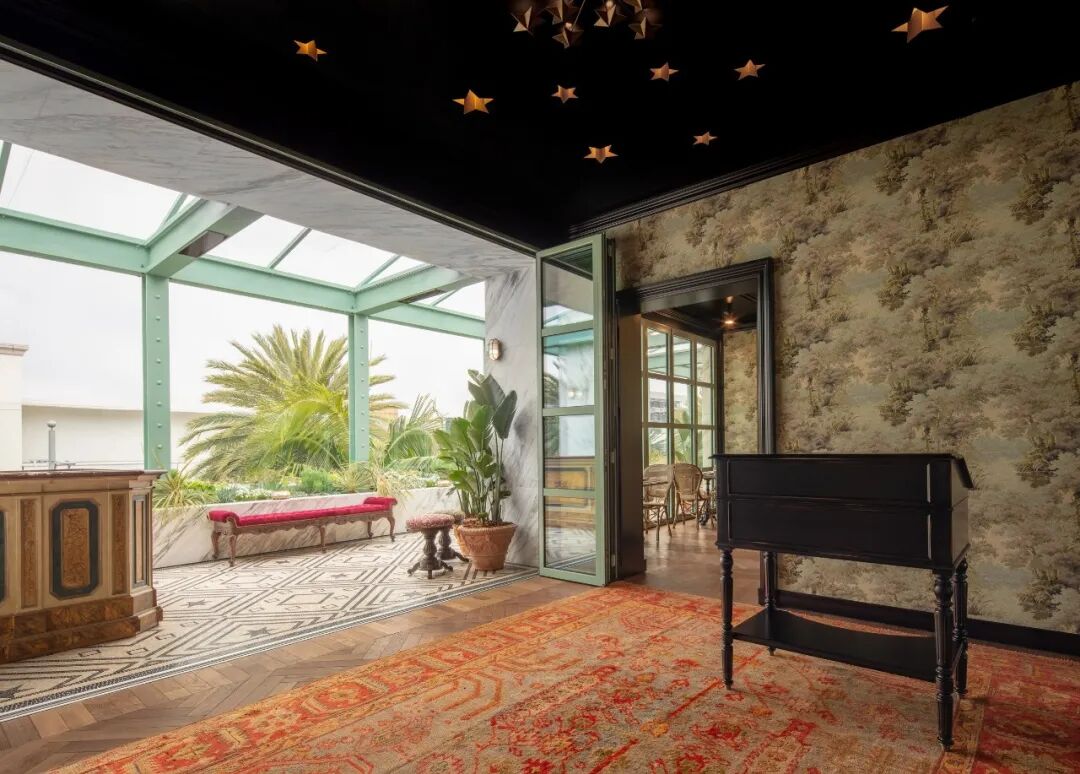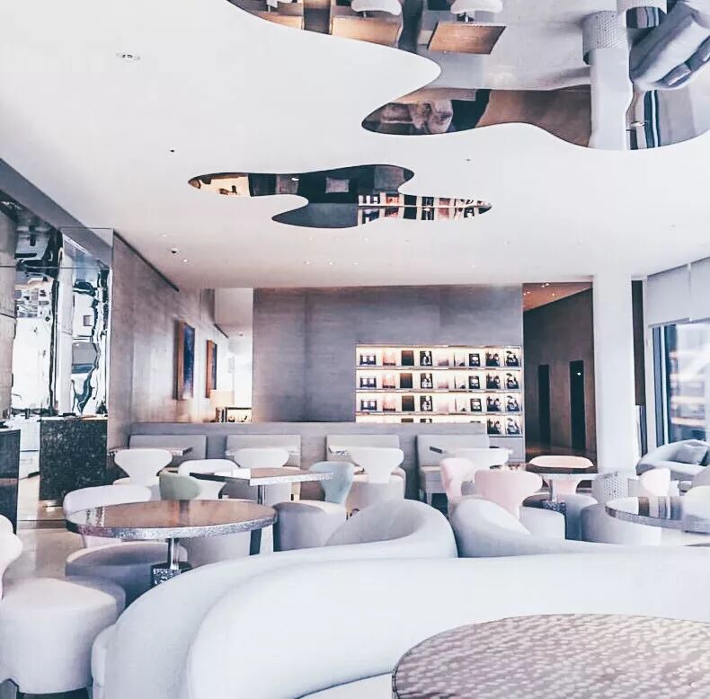 随处可见意式与美式的碰撞,门口的棕榈树与整个餐厅的色调格外搭调,店面通体马卡龙色调,轻快而又明亮的大理石店面格外抢眼。步入一层大厅,抬头仰望“金色星空”,好像来到好莱坞的星光大道。店内的墙纸全部来自于Gucci Décor家饰系列的林地印花壁纸。