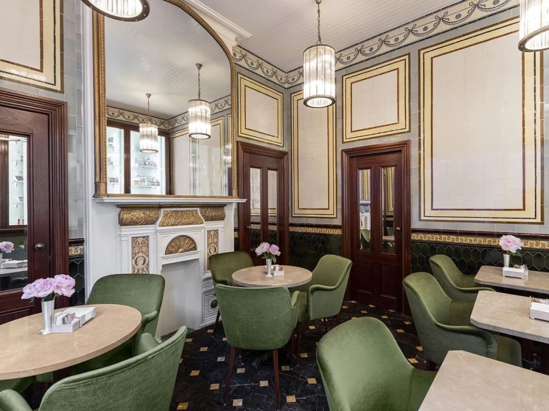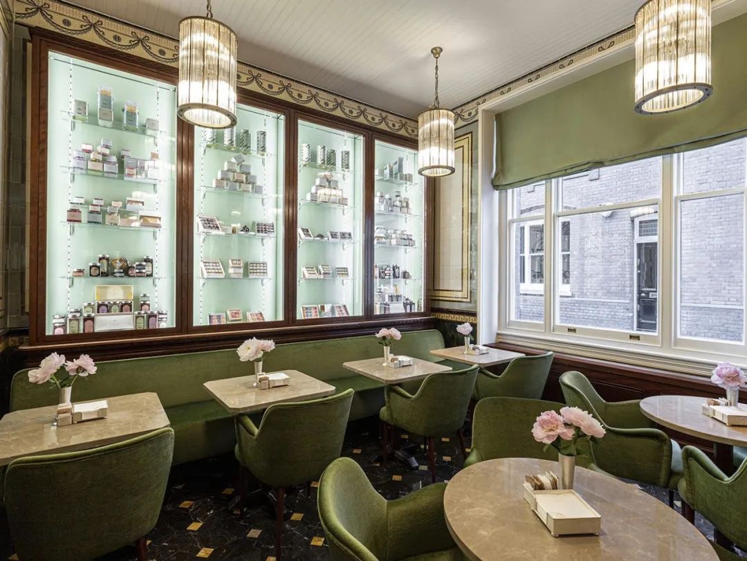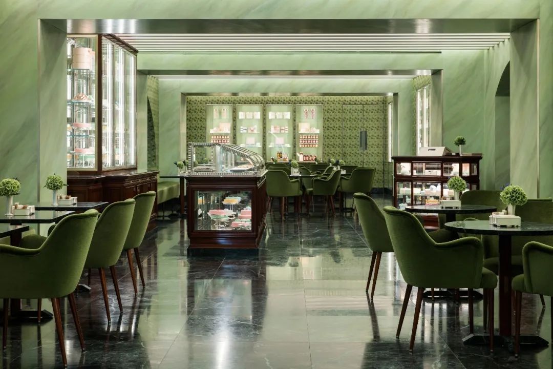 绿色威尼斯石膏墙面与同色系花卉提花织锦相互映衬,绿色阿尔卑斯大理石地面与天花板上未加装饰的木质横梁上下呼应,在维持原本风貌的同时展现了名店独特的优雅气质。
