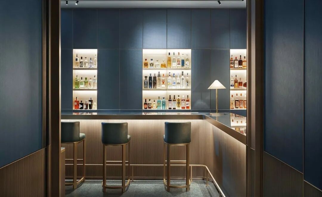 沿着吧台步入餐厅,金色带有质感的楼梯蜿蜒纵深直至二楼,蓝色柔软包装的墙壁在暖色的灯光映衬下,格外显质感,室内摆放专门为咖啡厅定制皮革的织物的座椅。