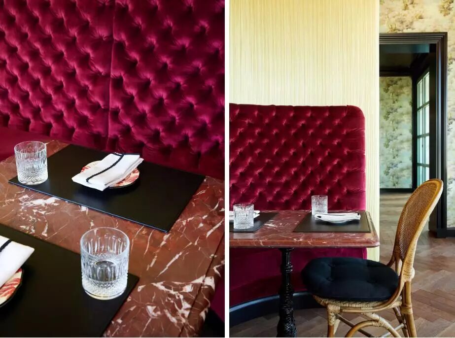 就餐区共有50个餐位,分室内和露台下。室内地面用了意大利经典式的鱼骨形木地板搭配复古红丝绒沙发、藤编的餐椅搭配大理石桌面的混搭风,再搭配由Michele亲自设计的餐盘,经典Gucci复古风美学感十足。