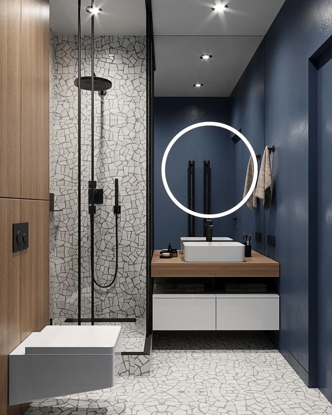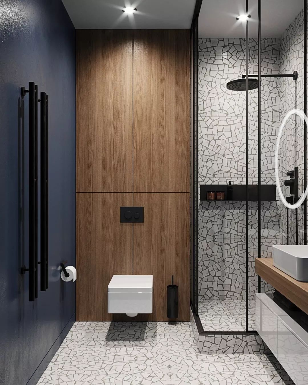 卫生间内碎石地板和墙面刻画出肌理,蓝色的背景墙时尚大气,通过唯美的规划分割,完美实现功能与美感的结合,盎然有趣。