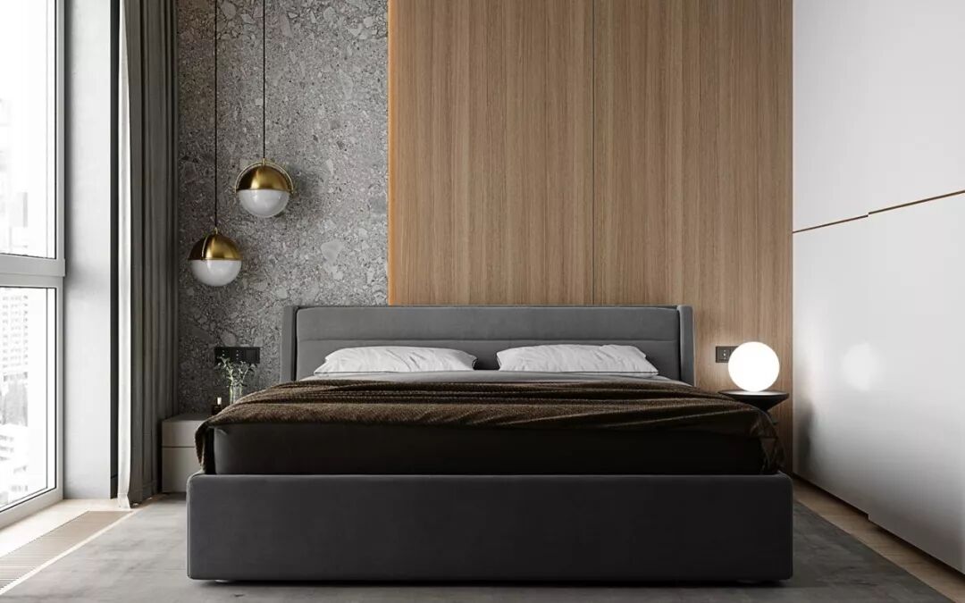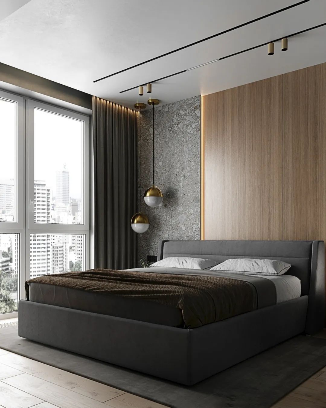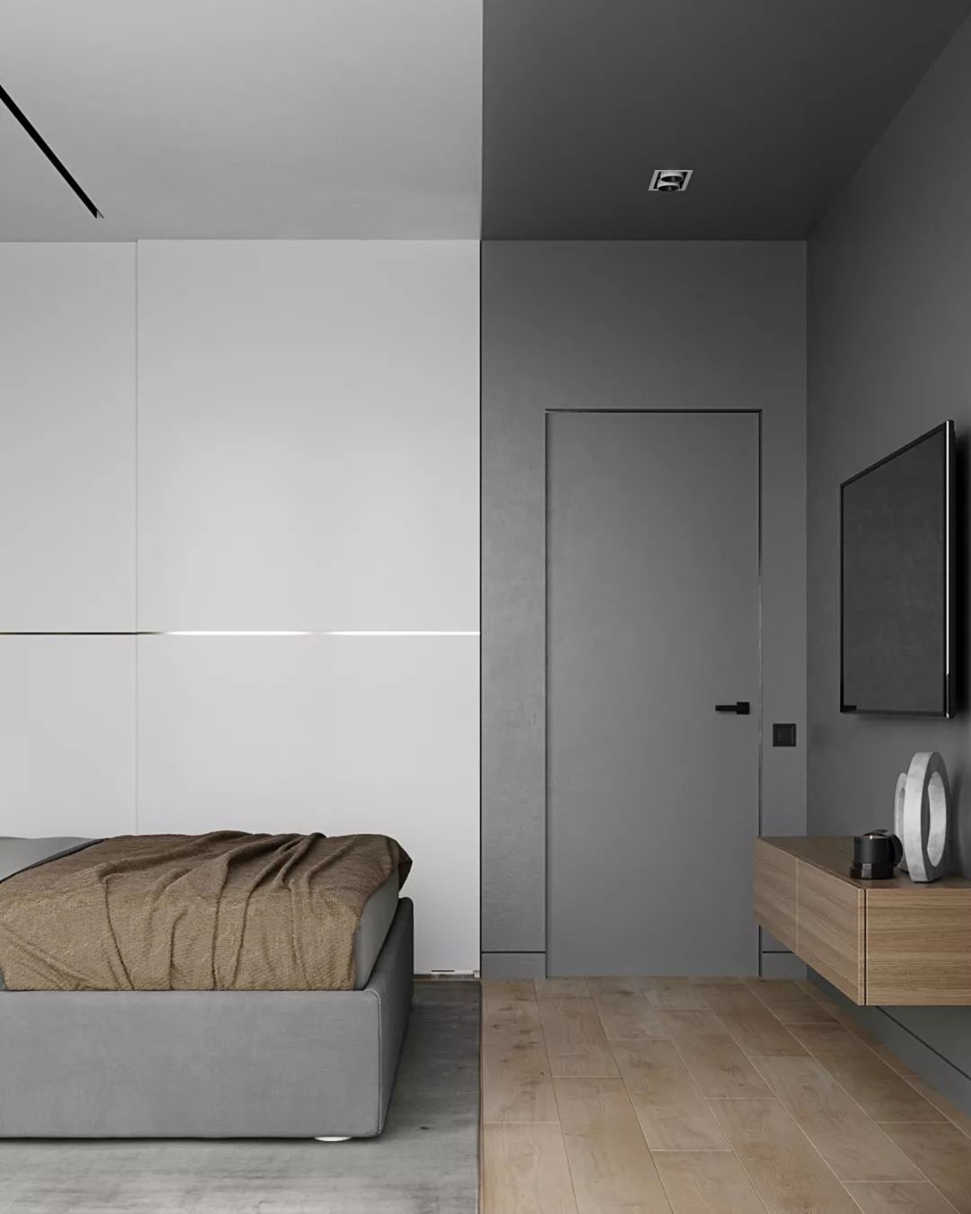 另一房间同样利用木色与高级灰的色调,散发的轻松感将一天的疲惫驱散,灰色的家纺增添了室内的安静感觉。