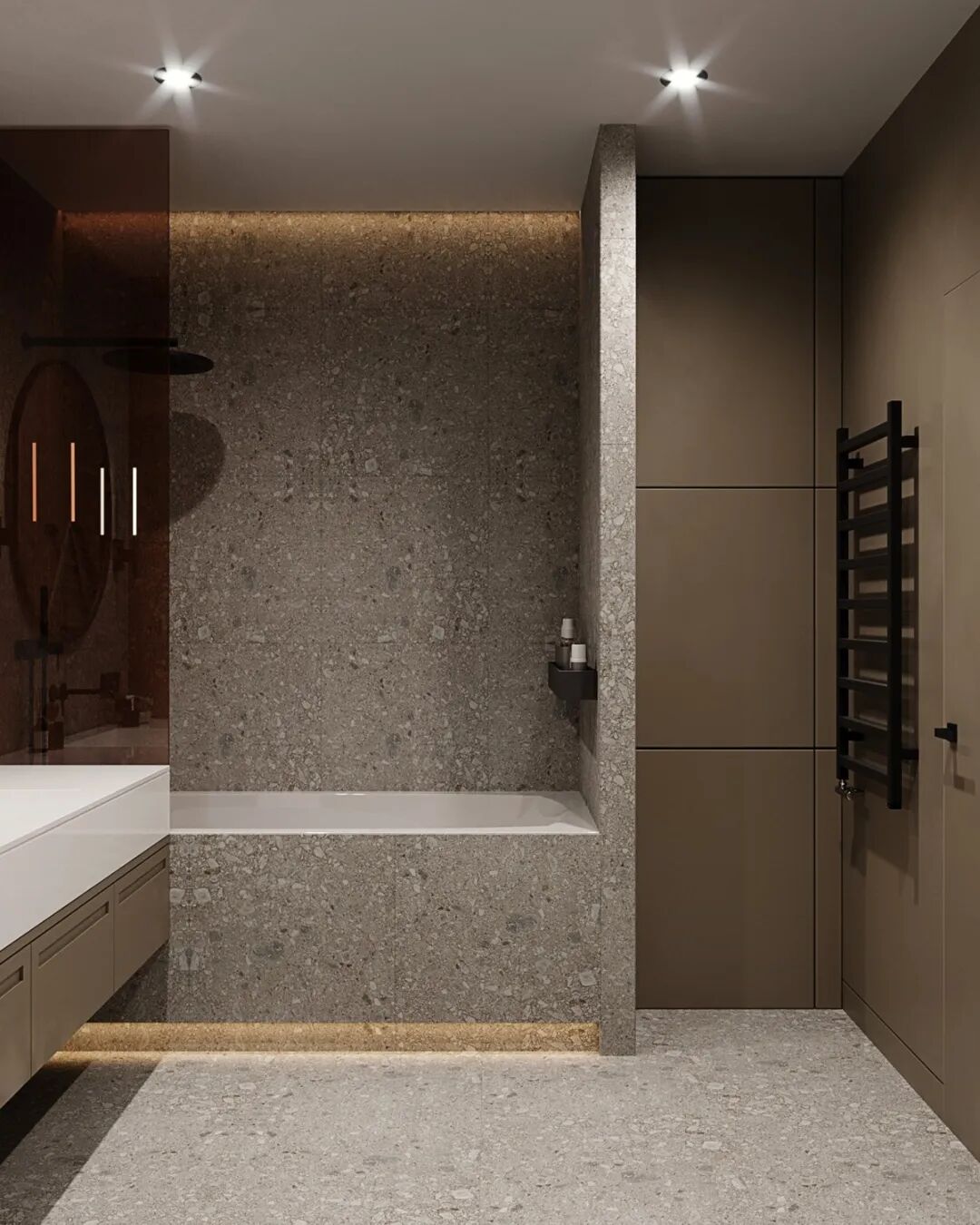 卫生间用水磨石铺设的地板和墙面,带有储物空间的简约洗漱台,可以放置毛巾、洗漱用品等等,镜子的运用也扩大了视觉空。