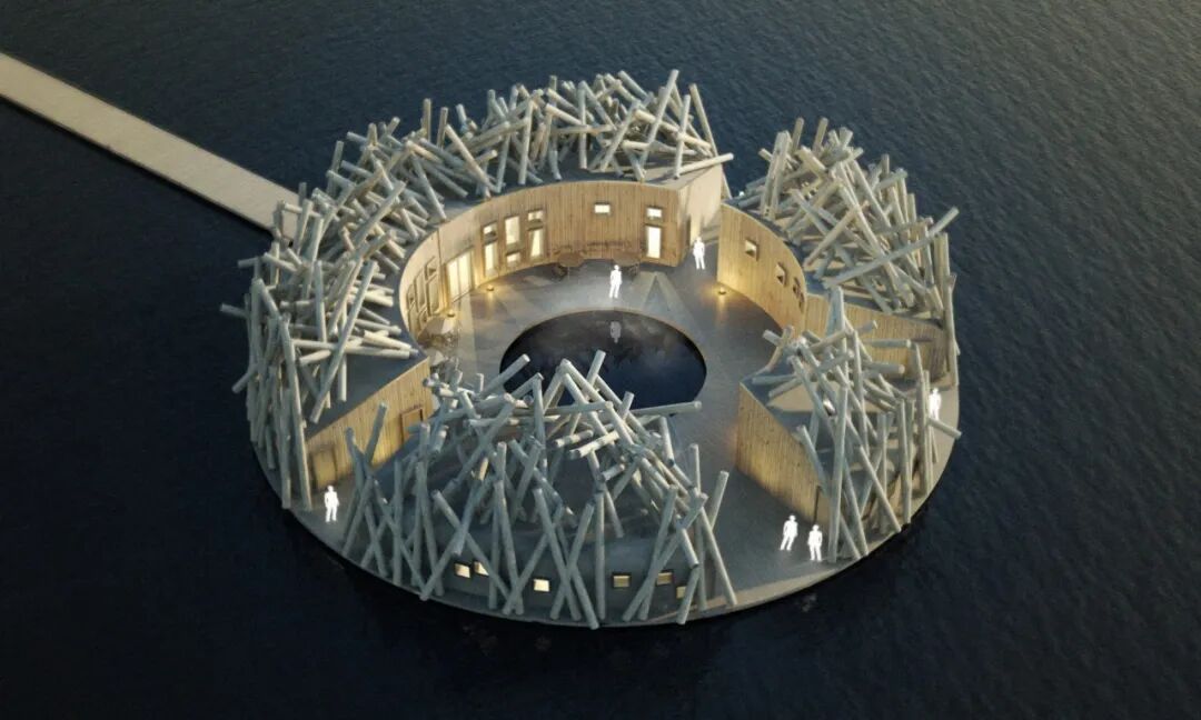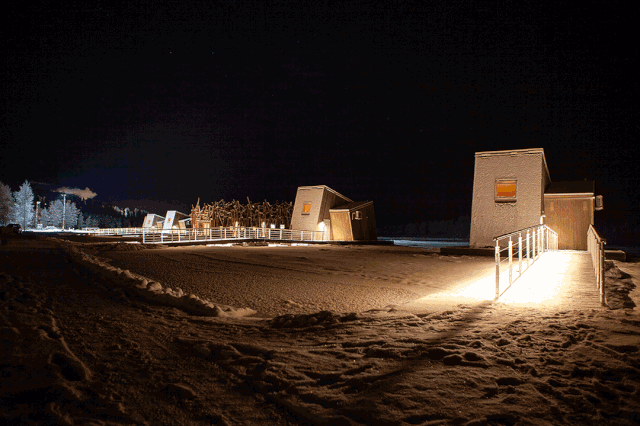 浴场纵横交错的圆木造型创造了一个充满安全感的环境,仿佛一个待人们归家的“巢”,尽管所有七栋建筑都将被牢牢地固定在原地,但它们可以自由地漂浮在水中或冻结成冰。