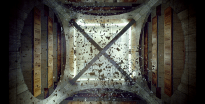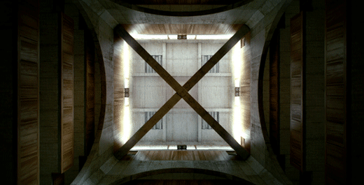 竖向中庭的顶部,竟是一个超大的X型结构,显得非常神秘。