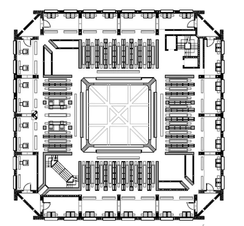 外圈阅览区最光线充足,中圈藏书区采用人工照明,中庭通过侧天窗采光。