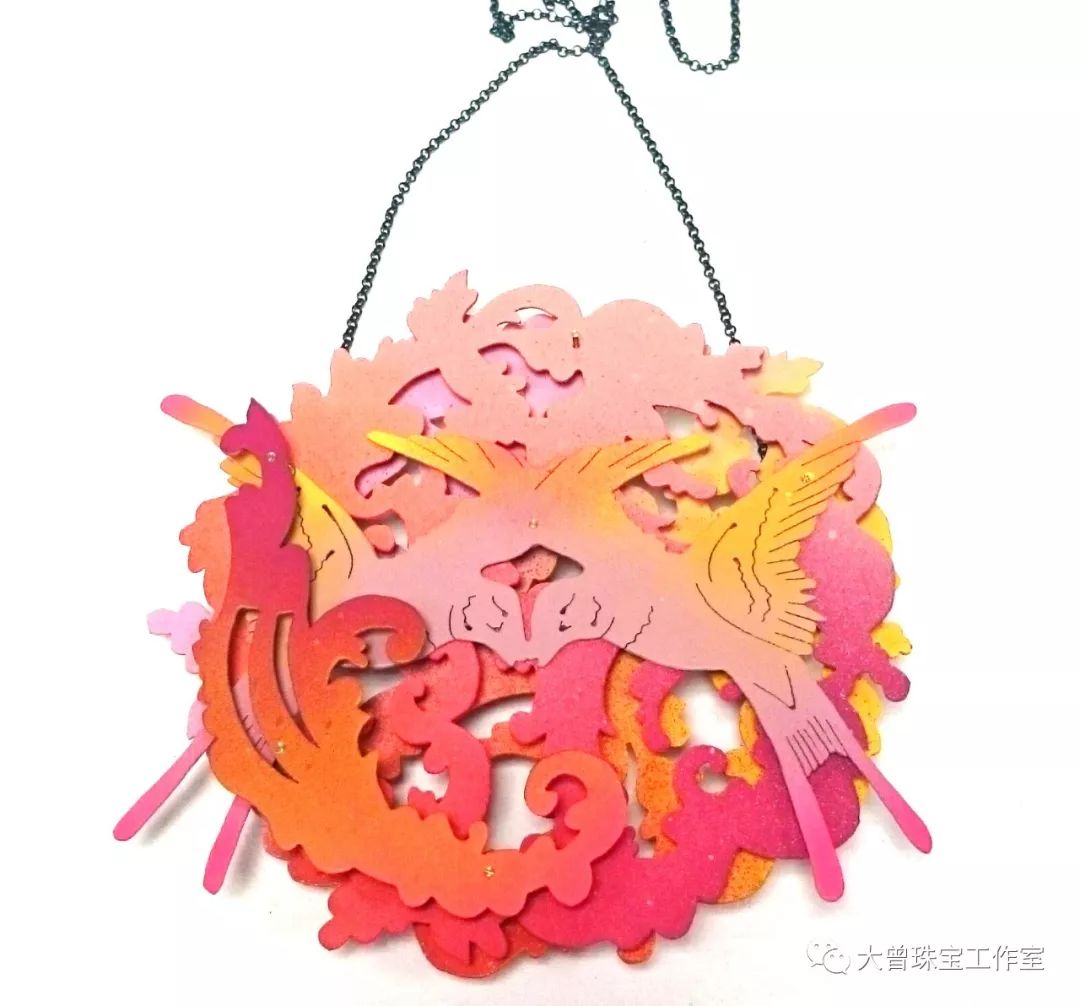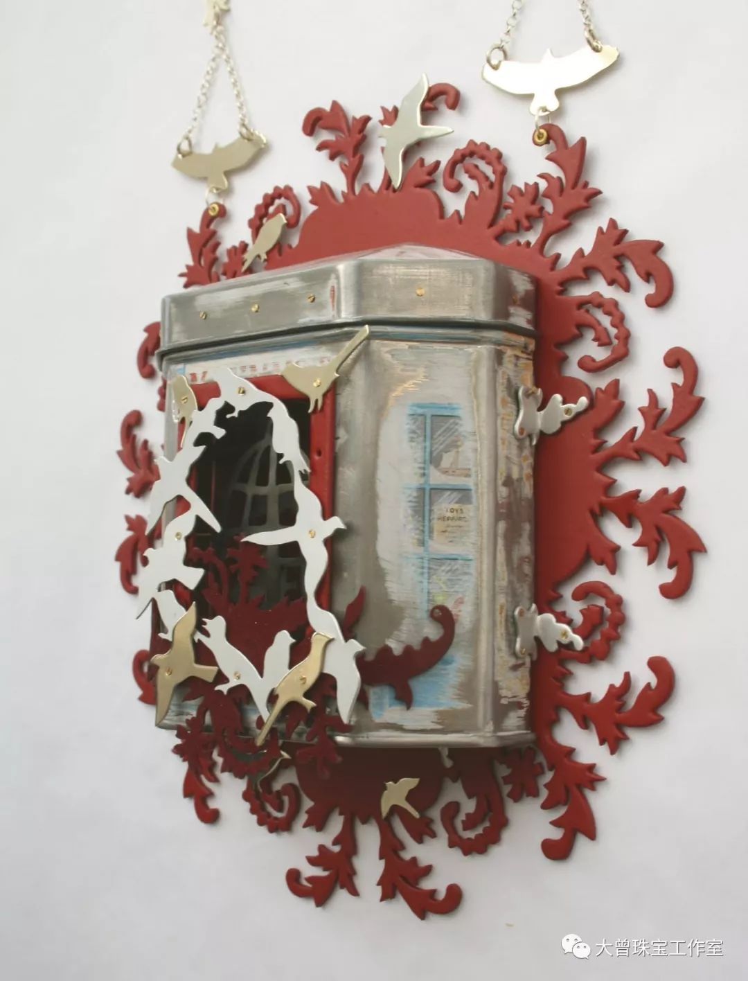 “我的首饰灵感主要来源于童话故事,童谣,歌和故事。狼、鹿、树、森林和小红帽是我的小宇宙的中心,但是他们没有必须呆在他们传统的地方。我想通过人物角色,颜色和材料来讲述故事,我希望人们可以通过我的作品创造出新的故事。氧化铝、薄木片、黄铜、镀金金属和银是作品的主要材料。我的作品中运用了大量色彩和不同的肌理去营造和描绘出不同的气氛。通过多层金属来构建立体3d效果的作品。有些作品体积会大一些,但是因为材料本身轻,所以还是可以适合佩戴。作品的尺寸可以一直提醒佩戴者他们有在佩戴作品;作品需要足够的空间和注意力。作品可以佩戴也可以挂在墙上,变成了一副可以随身携带的画。”
