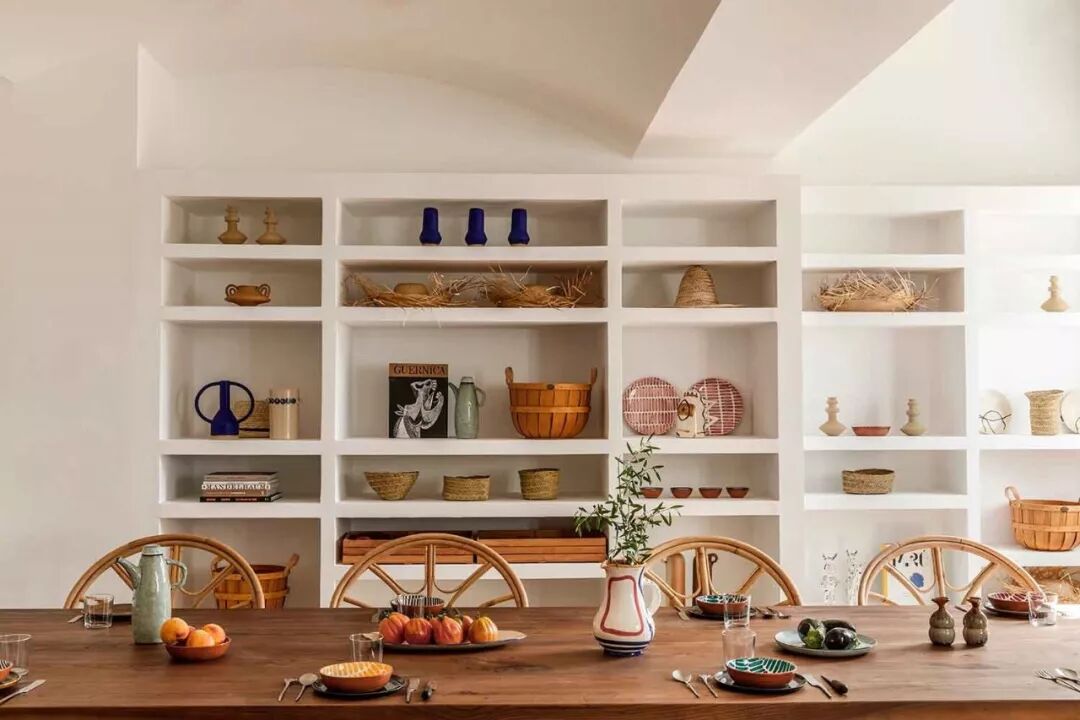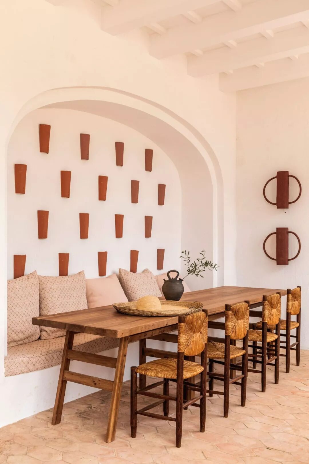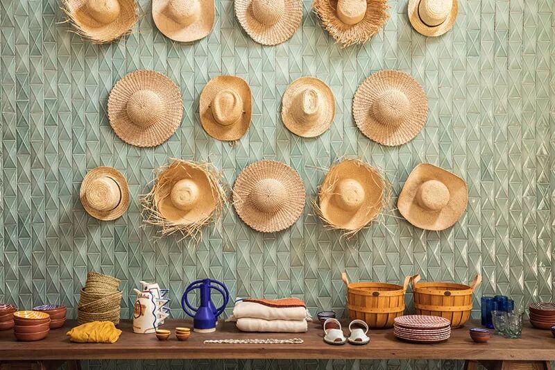 其中一面墙壁用绿色的釉面瓷砖为背景,墙上安装了草帽,带入自然气息,长条木桌子上摆放了一些陶土罐和编织篮,让整个空间拥有一种随意简单的舒适感。