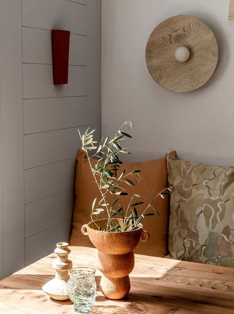 餐桌和卡座是木质,墙上的壁灯也经过精心设计,与半圆形壁龛形成呼应,让整个空间拥有一种柔和的线条艺术感。