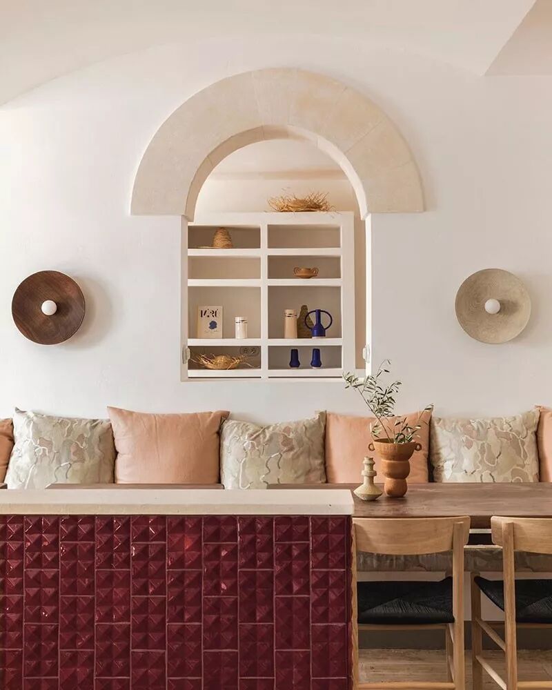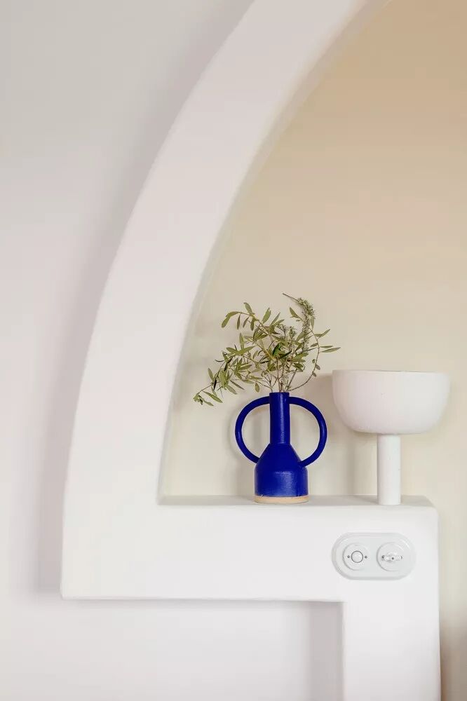 室内的布置尽量简单,融入希腊爱情海风格的墙面设计,白色灰泥粉刷墙面,墙体内设置了一些拱形壁龛,用来摆放陶罐等艺术品。