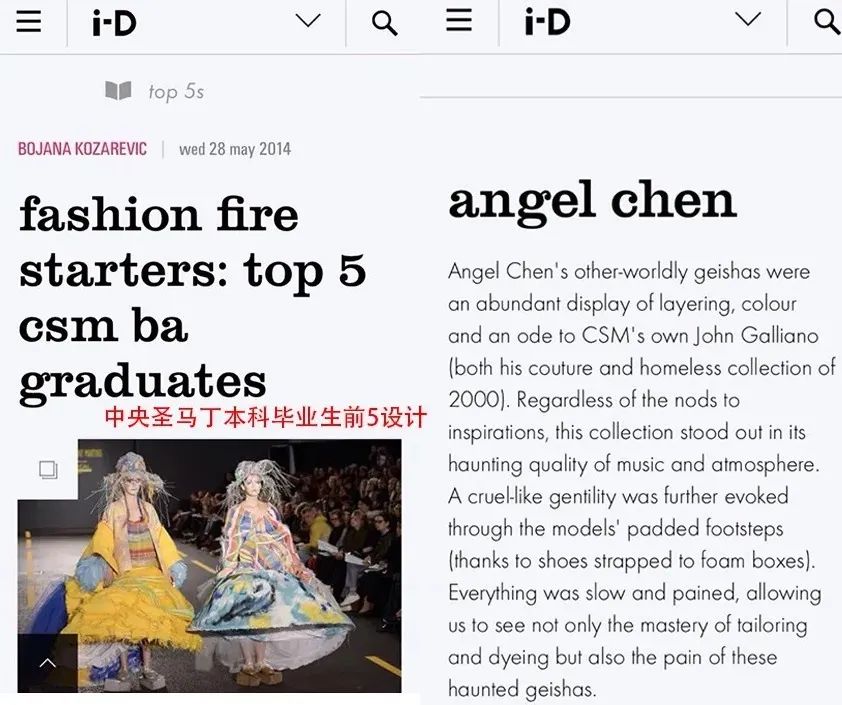 于是,一回到伦敦,安琪便开始着手她的毕业设计。她决定做一个婚礼系列 “Les Noces”。这个系列讲述了两个女孩在非洲旅行遇到对方,彼此相爱并决定结婚,邀请了世界各地的同性恋者来参加森林婚礼的故事。因此在整个系列当中混合婚纱、礼服、民族元素的重新设计,并配上绚丽色彩组成一个缤纷有趣的婚宴派对。除了表达“爱与平等”,安琪在系列中还使用了一些特殊的环保材质,譬如咖啡袋。这些咖啡包装袋都是从非洲以及美洲漂洋过海而来,她通过二次创作将被废弃的麻布、鱼线、金属等结合纸线、塑料和羊毛运用粗线针织创造出具有雕塑感的新面料。这个毕业作品《Les Noces》引起了很大的轰动,登上了英国《VOGUE》、《Evening Standard》、《时代》周刊,并被i-D杂志评为年度毕业首五名设计。年创立同名品牌ANGELCHEN ,并赢得FashionScouts 的Onesto Watch 奖项。除此之外,陈安琪连续2年在BOF 500榜单中,但她的成绩也不止于此,毕业后她去了 Dior、Alexander Wang 及 Marchesa,无数人梦想的地方工作。而热爱设计的她,还想做自己的风格、品牌,所以在2014年勇敢创立了ANGEL CHEN。03
